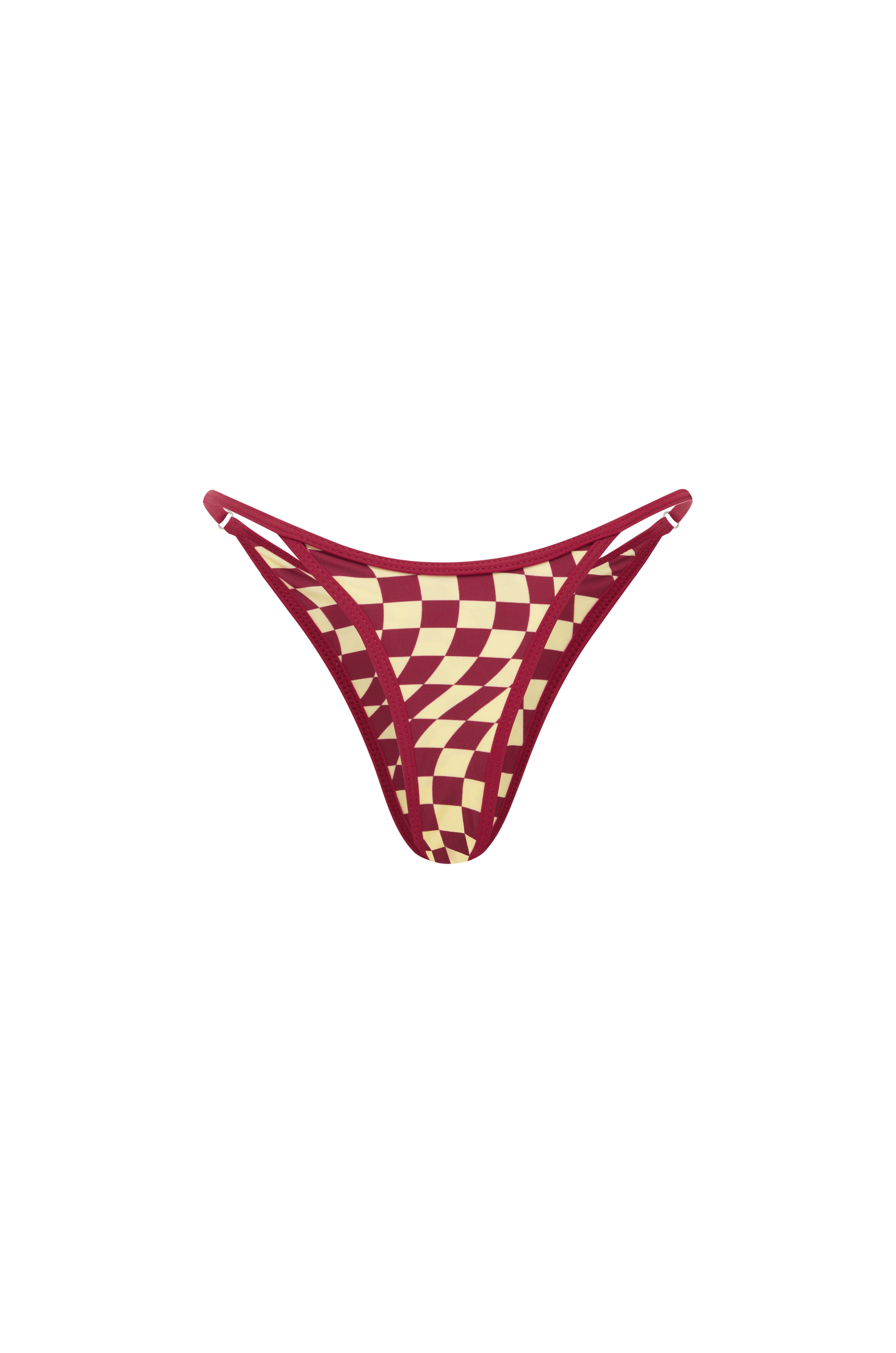 Front view of cherry and yellow checkered bikini bottoms with thin adjustable side straps, displayed on a plain background.